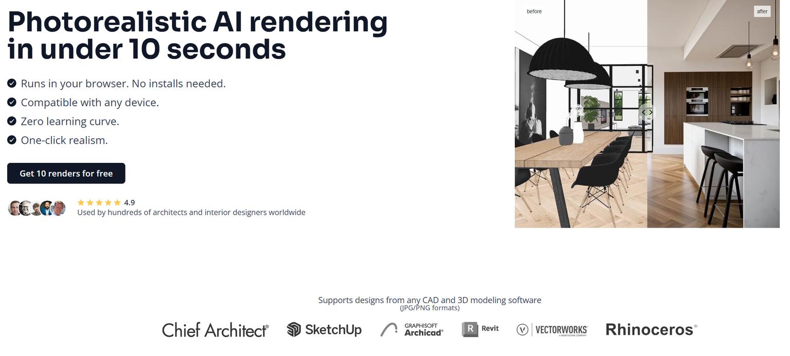 Speed: Generates photorealistic visuals from exported model images (JPG/PNG) in approximately 10 seconds.